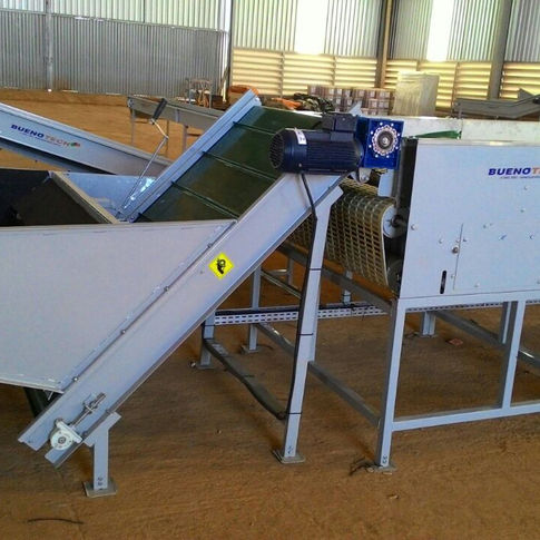 Módulo Classificador – medindo 1.200mm de comprimento por 1.200mm de largura, armação e laterais em aço carbono, lateral revestida com inox 304, com correia de PVC perfurada com FURO REDONDO de Ø36mm, movida por roletes de aço carbono, 01 moto-redutor de 0,50 CV com inversor de frequência, com 01 vibrador com motor de 0,75 CV com inversor de frequência.
