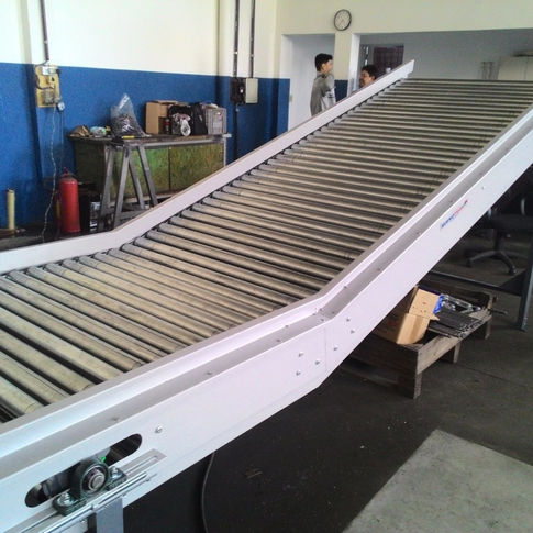 With sides and feet in carbon steel profiles, with galvanized carbon steel wheels, driven by galvanized carbon steel chain through a motor reducer.